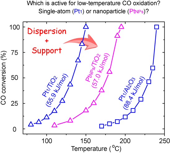 该工作中,蒯龙研究小组运用喷雾热解控制合成技术、同步辐射X-射线吸收谱技术以及密度泛函理论,在Pt/金属氧化物体系中解决了学界关于单原子Pt位点是否为催化CO低温氧化活性中心的争论。研究表明:1)Pt的化学性质受分散特性和载体双重因素决定;2)通常情况,单原子Pt仅在可还原性载体才表现高活性;3)单原子分散让活性金属利用率达到最大化(100%)。审稿人高度评价该项工作,认为“Their findings not only interpreted the diverse catalytic behaviors of single-atom Pt supported on different metal oxides, but also guide to design and prepare superior Pt/metal oxide catalysts.”。该项工作得到国家自然科学基金、校杰出青年基金等经费资助,同时得到安徽师范大学耿保友教授等课题组的支持与合作!
