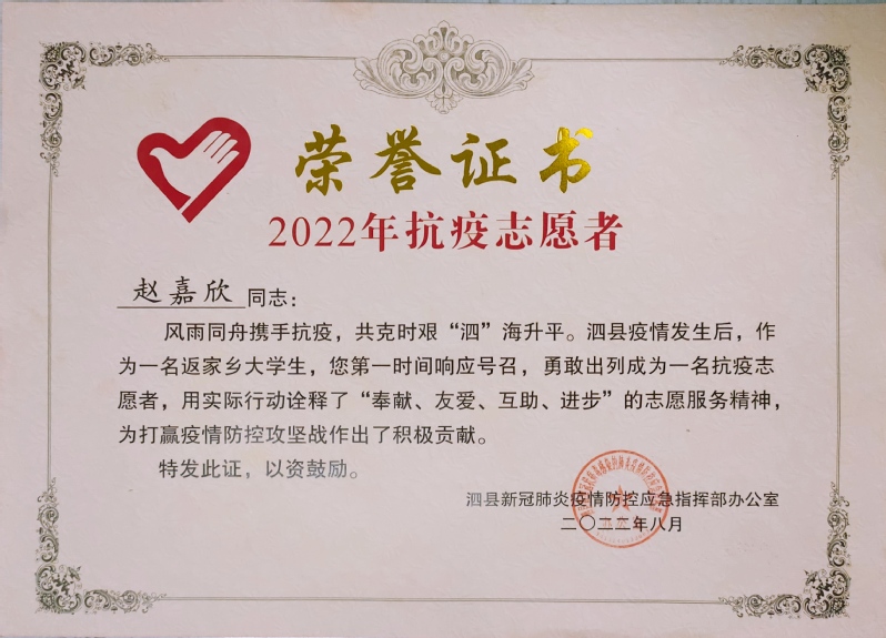 信中指出,2022年6月,泗县突发疫情,赵嘉欣积极响应党委、政府号召,勇敢出列,主动报名成为一名抗疫志愿者,该同学能够时刻严格要求自己,展现了当代老员工的优良素质和担当意识,赢得了家乡人民的肯定和好评。赵嘉欣同学的优异表现,得益于贵校的精心培养和悉心教导,祝愿贵校各项事业蒸蒸日上,祝贵校各位领导和全体教师身体健康、工作顺利、桃李芬芳学教泽绵长!