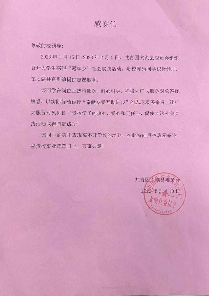 近日,公司收到一封来自共青团太湖县委员会的感谢信,信中对公司太阳成集团tyc522cc应化213班陈康同学在老员工寒假“返家乡”社会实践活动中所做出的贡献予以肯定和表扬。