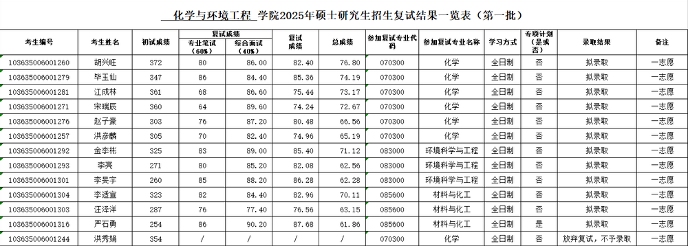 太阳成集团tyc522cc2025年硕士研究生招生复试结果一览表(一志愿)