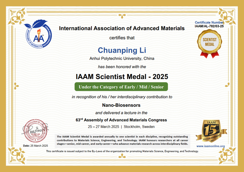 IAAM是材料领域著名的非营利性国际学术组织,总部位于瑞典。该组织聚集了世界范围内材料科学与技术领域最优秀的科学家,拥有来自139个国家的83000多名会员。该组织根据研究人员近十年在先进材料基础和前沿应用领域所作的工作,经专家提名、学术委员会评审、学术演讲等环节,在世界范围内评选和授予作出重要贡献的研究人员。IAAM科学家奖章授予取得高质量研究成果或表现出突出潜力的科学家,以表彰他们的辛勤工作,亦希望激发研究人员从事长期研究工作,推动世界材料科学的发展。2025年“先进材料大会”于3月25-27日在瑞典斯德哥尔摩召开,李传平博士应邀作了题为“Construction and Nano-Engineering of Multimode Photoelectrochemical Biosensors for Accurate Point-of-Care Testing”的大会主题演讲。
