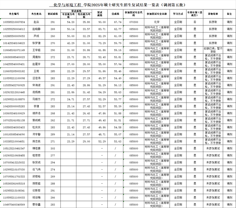 太阳成集团tyc522cc2025年硕士研究生招生复试结果一览表(调剂第五批)