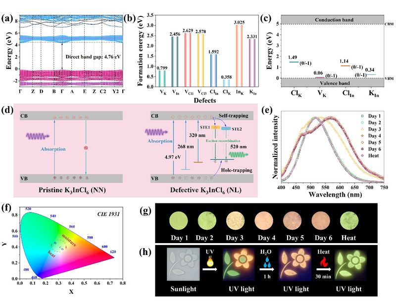 传统零维卤化物钙钛矿发光机理长期存在争议,且多数材料难以兼顾发光可调性与结构稳定性。该研究发现零维K3InCl6钙钛矿可通过合成条件调控实现绿色发光,系统揭示其发光源于缺陷辅助自陷激子辐射复合:晶格中阳离子空位与反位缺陷形成空穴捕获态,软化晶格并促进自陷激子生成,最终产生高效绿色荧光。同时,该材料在湿度与热处理下可发生可逆的水合-脱水相变,荧光颜色从绿色可调至黄橙色,具备稳定的光色切换特性。